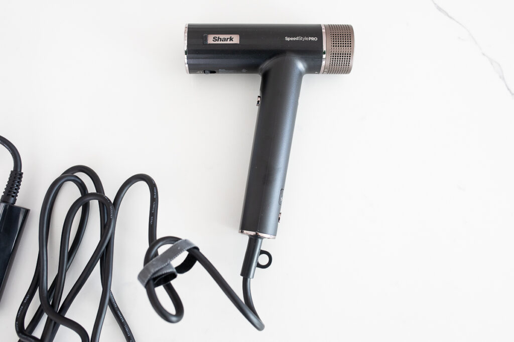 This hair dryer has 2 speed settings and 3 heat settings including a cool shot button. I did find that holding it was a little bit awkward and took some getting used to. The placement of the buttons were right next to where I held the hair dryer, so I kept hitting switches b accident at the beginning. Now that I’ve had it for a while, I don’t do that, but it definitely took some getting used to.