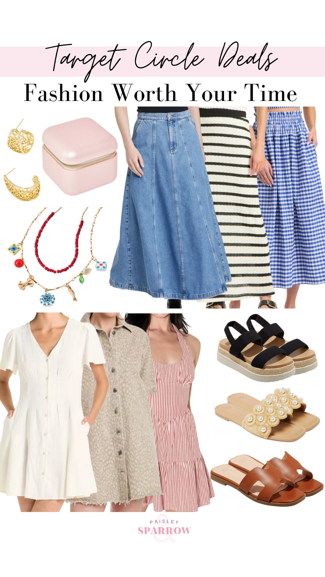 Earrings | Jewelry Box | Necklace | Denim Skirt | Knit Skirt | Gingham Skirt | White Dress | Leopard Dress | Red Dress | Platform Sandals | Ornament Sandals | Brown Sandals